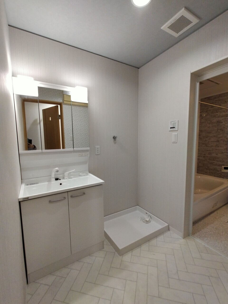 3面鏡タイプ洗髪洗面化粧台新調、洗濯用水栓新調、