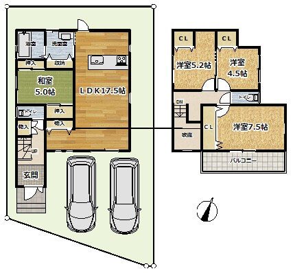駐車場2台分、バス1坪以上、2面採光、